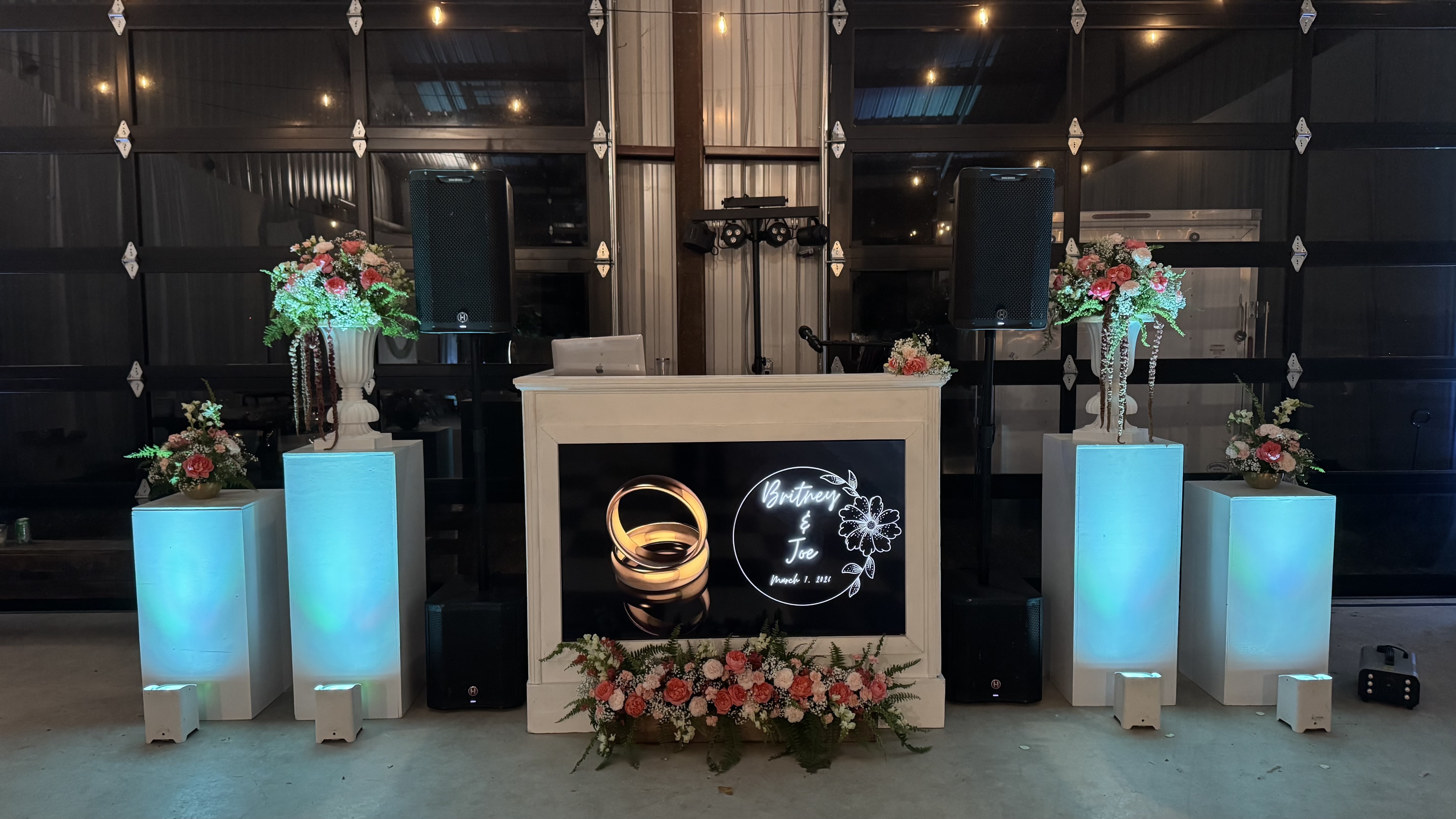 Our Premium Video DJ Booth enhanced with elegant floral styling and pedestal décor to create a beautiful focal point that blends seamlessly into wedding décor.